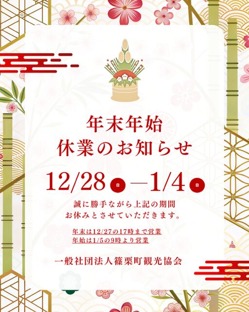 年末年始休業のお知らせ 重要なお知らせ 2025.12.27 篠栗デジタルフォトコンテスト 受賞作品総評・入選作品写真掲載& 観光協会カレンダー販売中! 新着情報 2025.12.24 令和7年度篠栗デジタルフォトコンテスト受賞・入選作品発表 おすすめ情報 2025.11.18 【篠栗町観光交流拠点339Re 営業時間変更のお知らせ】 重要なお知らせ 2025.10.31 令和7年度 篠栗デジタルフォトコンテスト開催のお知らせ イベント 2025.09.24 森林セラピーウォーキングデー2025募集について 重要なお知らせ 2025.10.05 【8月11日(月)店休日のお知らせ】 新着情報 2025.08.11 篠栗祇園夏まつり 花火大会実施のお知らせ 重要なお知らせ 2025.07.12 篠栗祇園夏まつり「ご案内・注意事項」 重要なお知らせ 2025.07.08 7月12日(土)開催 篠栗祇園夏まつり交通規制のお知らせ 重要なお知らせ 2025.07.07 123次へ > 月別アーカイブ 2025年12月年 (2) 2025年11月年 (1) 2025年10月年 (2) 2025年9月年 (1) 2025年8月年 (1) 2025年7月年 (3) 2025年6月年 (3) 2025年5月年 (1) 2025年2月年 (6) 2024年12月年 (2) 2024年10月年 (1) 2024年7月年 (1) 2024年4月年 (4) 2021年11月年 (1) カテゴリー 重要なお知らせ (15) イベント (7) おすすめ情報 (12) 新着情報 (24) 篠栗町観光協会 > インフォメーション > 新着情報